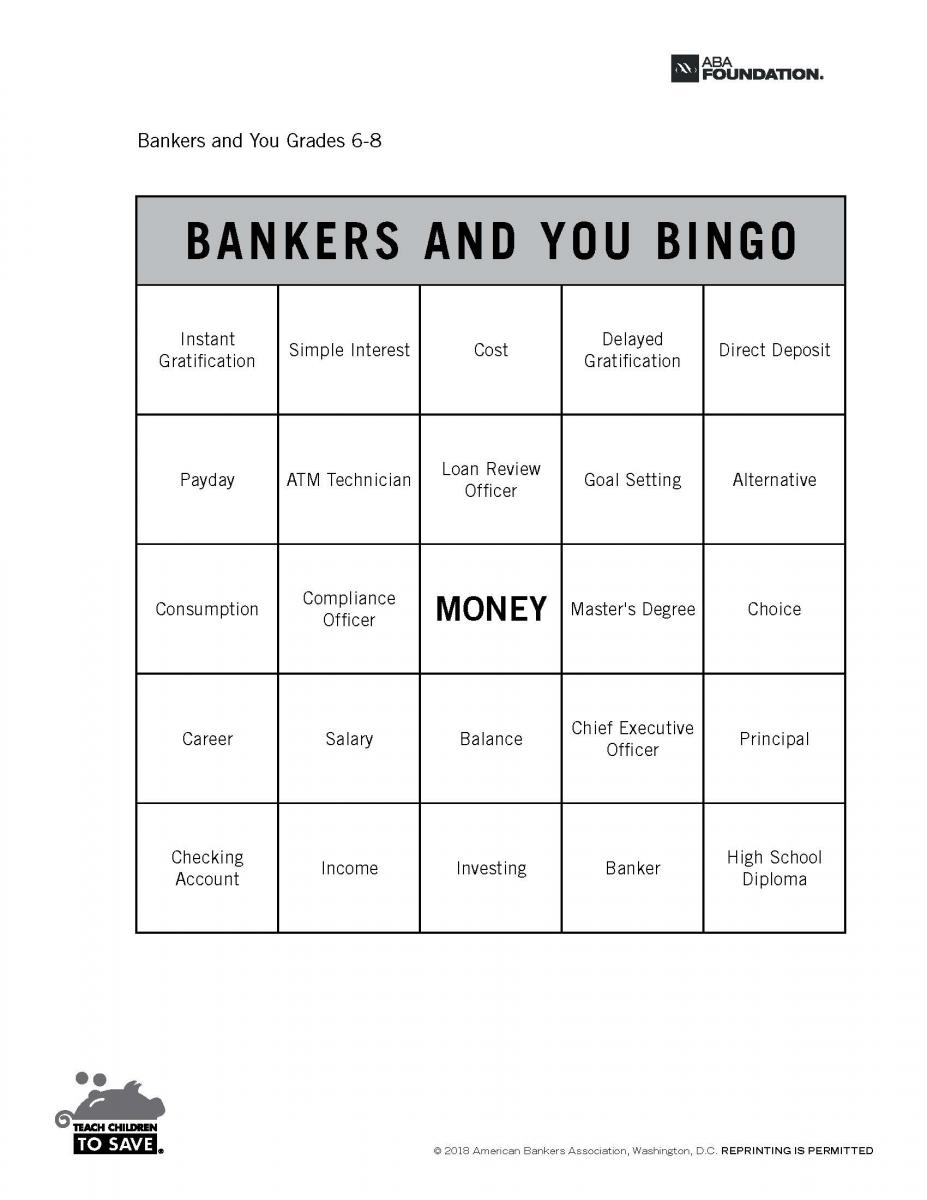| Spot the Banking Difference | Color and Cut Savings Jar Wraps | Needs Vs. Wants Coloring Book | Bankers and You Bingo |