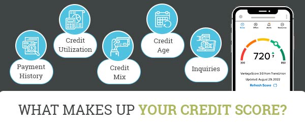 Your payment history (how often do you pay your bills on time) is the most important factor. It accounts for about 35% of your credit score.